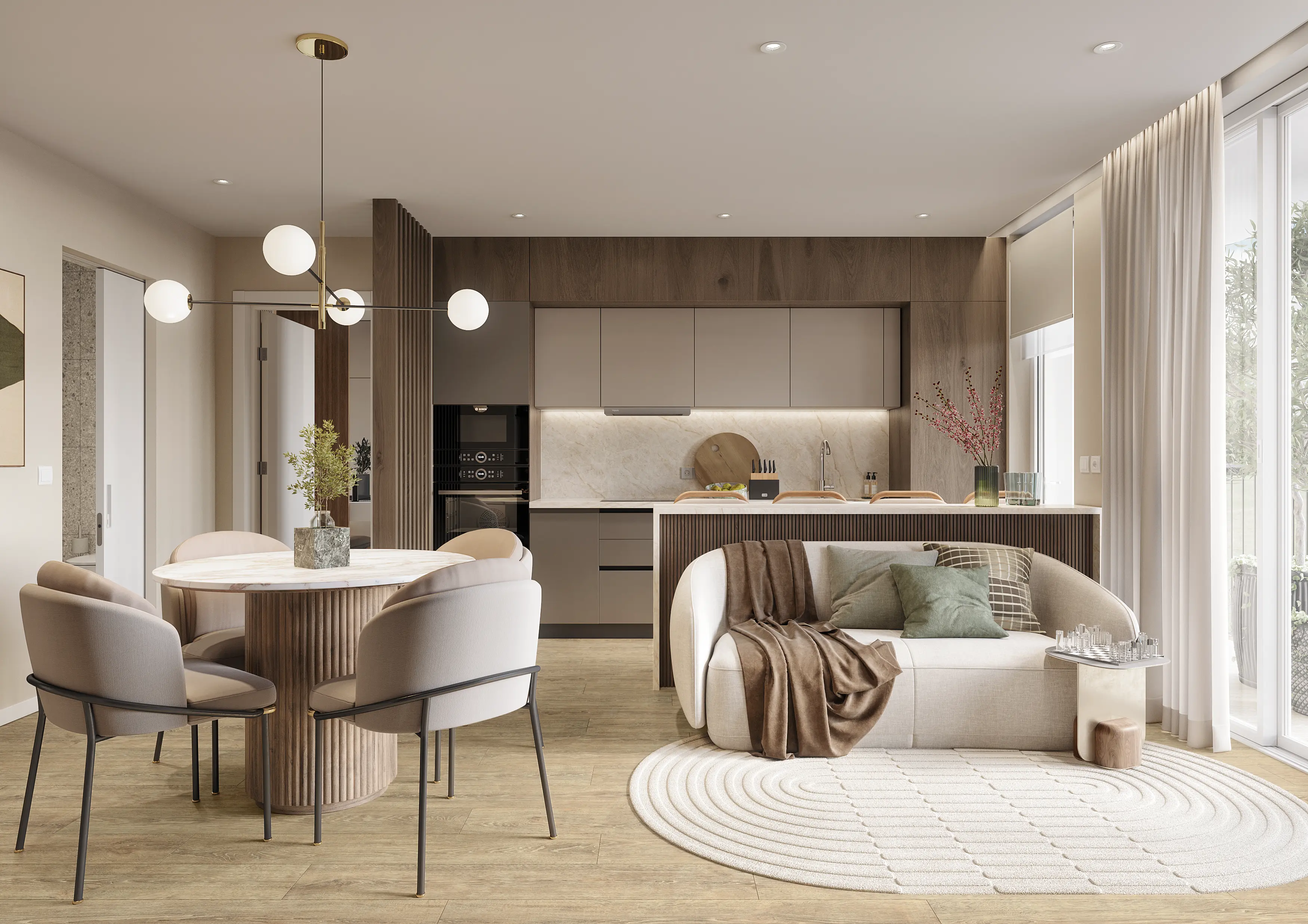 The T1 apartments at Evergreen Pure stand out for their functional layout and welcoming ambiance. With areas ranging from 54 m² to 68 m², some units feature generous outdoor spaces that extend the living experience and offer privacy for enjoying the open air.