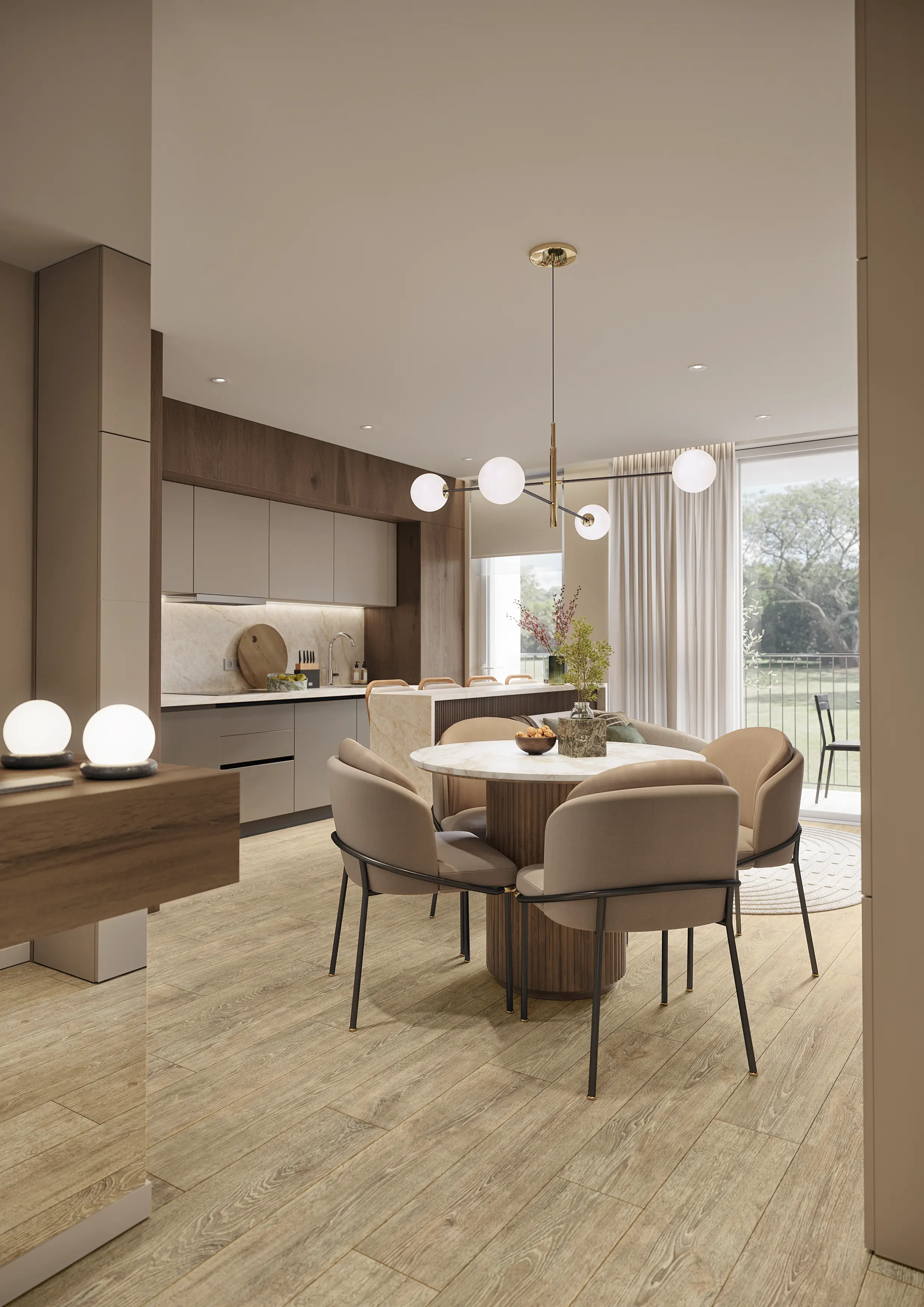 The T1 apartments at Evergreen Pure stand out for their functional layout and welcoming ambiance. With areas ranging from 54 m² to 68 m², some units feature generous outdoor spaces that extend the living experience and offer privacy for enjoying the open air.